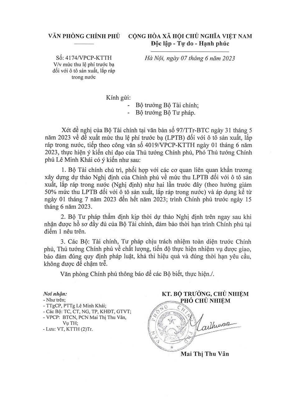 Vừa qua vào ngày 7/6/2023 văn phòng chính phủ đã có công điện gửi 2 bộ Tài Chính và bộ Tư Pháp về phương án giảm 50% lệ phí trước bạ cho Ô tô lắp ráp sản xuất trong nước, thông tin cụ thể như sau: